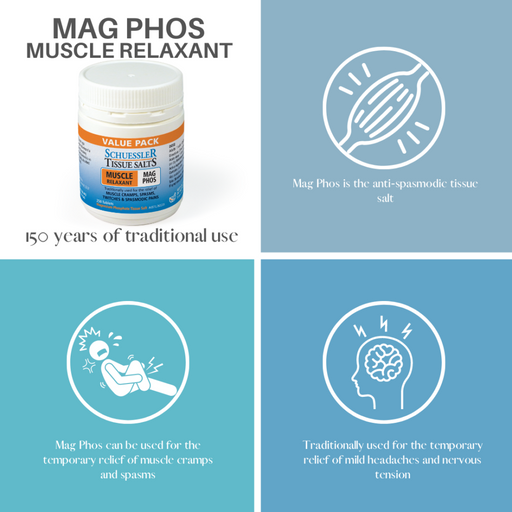 Muscle RelaxantMag Phos is the anti-spasmodic tissue salt. It is a remedy traditionally used for the temporary relief of symptoms such as cramp...
