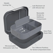 - LEAK-RESISTANT & EXTRA THICK OUTER SHELL: The double-walled tray holder secures each food compartment with its silicone-sealed, leak-resistant lid. When you’re ready to heat up or clean up your food, take out the food tray and use it in the microwave or dishwasher!