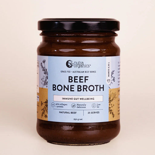 Slow-cooked grass-fed beef leg bone extract, evaporated sea salt. No additives, dyes, artificial colours, hormones, starches or yeast (as found in most powdered broths.). MPI grass-fed/finished.