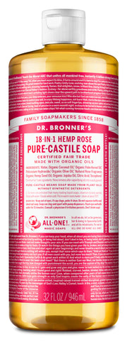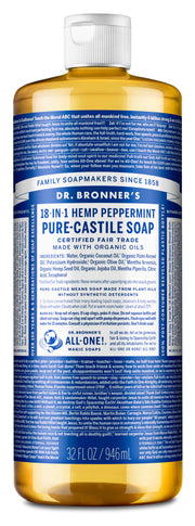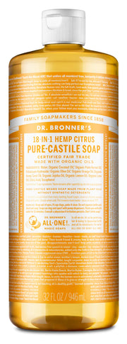 Dr. Bronner’s 18-in-1 Pure-Castile Soaps are good for just about any cleaning task. Face, body, hair & food, dishes, laundry, mopping, pets—clean your house and body with no synthetic preservatives, detergents or foaming agents—none! Dilute! Dilute! OK!! Need recipes? Read Lisa Bronner's Liquid Soaps Dilutions Cheat Sheet.