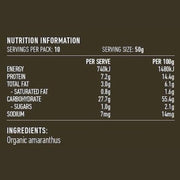 Lotus Organic Amaranth Flour is packed in a 500g re-sealable oxygen barrier bag to preserve freshness.