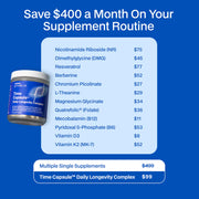 Time Capsule is designed as a simple “stack in a bottle” for adults who want long-term wellness support. Nicotinamide riboside helps support NAD+ and cellular energy. Resveratrol and other antioxidants help protect cells from free radical damage. Berberine and chromium support healthy metabolic and glucose processes. Activated B vitamins and magnesium help maintain energy production and nervous system function, while vitamin D3 and K2 support bone and cardiovascular health. L-theanine and dimethylglycine support stress resilience and overall wellbeing.