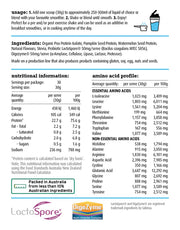 Organic Pea Protein Isolate, Pumpkin Seed Protein, Watermelon Seed Protein, Peanut Powder, Natural Flavours, Stevia, Probiotic LactoSpore 50mg/serve (Bacilus coagulans MTCC 5856), Digezyme® 50mg/serve (α-Amylase, Cellulase, Lipase, Lactase, Protease). CONTAINS PEANUTS.